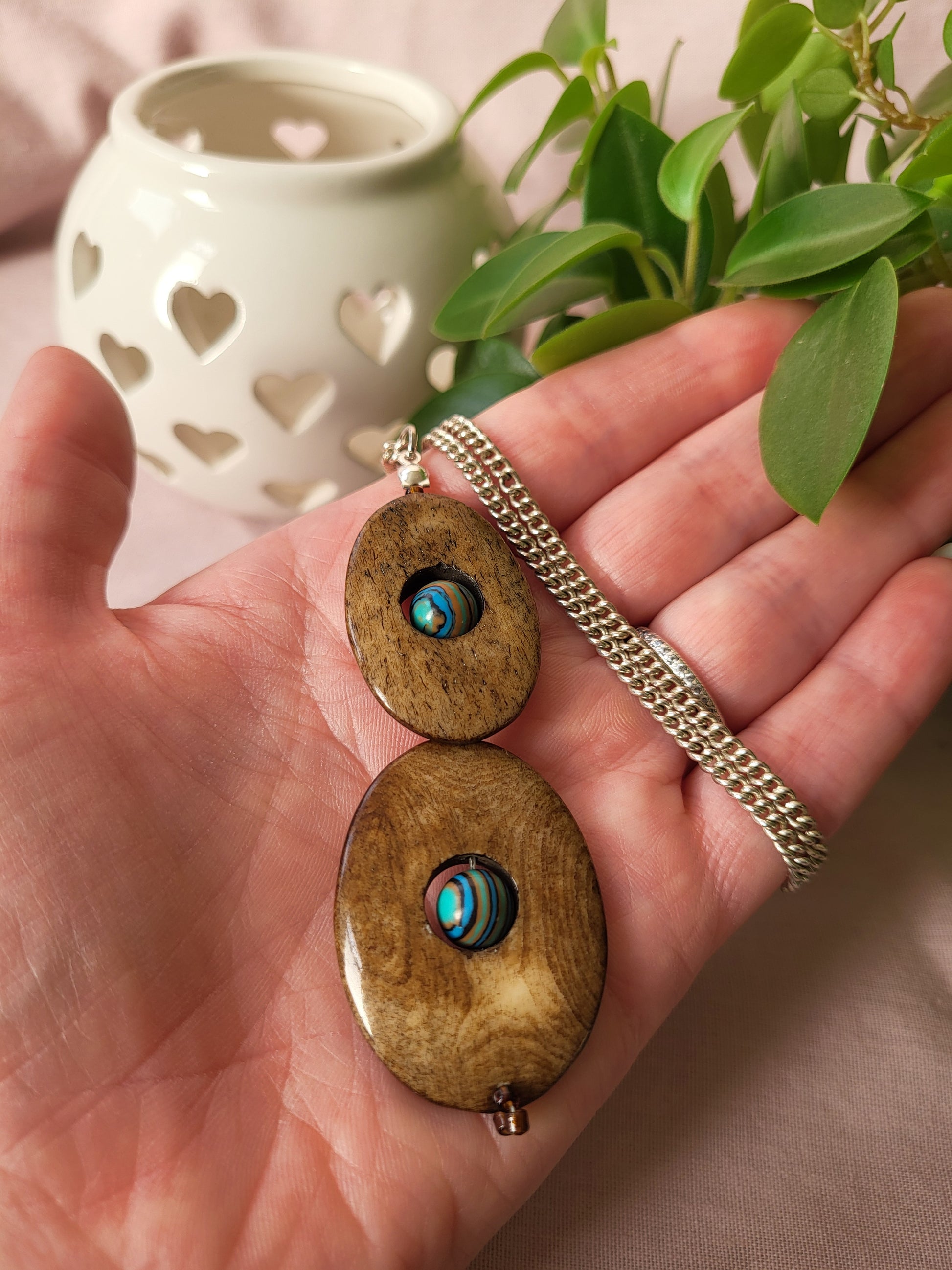 Wood Effect Double Oval Pendant with Blue Malachite Centre. Upcycled and One of a Kind